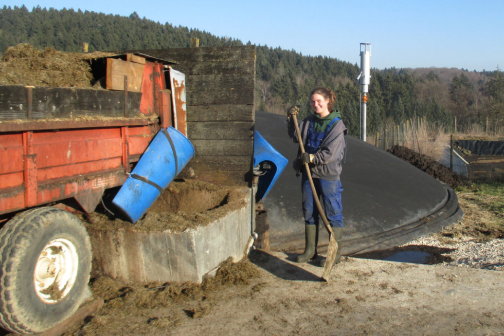 Dreimal am Tag füllt Christine die Anlage mit Rindergülle und Silage aus Gerste und Kleegras. Daraus wird Biogas und das versorgt den Hof dann mit Strom und Wärme. "Es ist ja schon beeindruckend, wie man aus Gülle und Silage so viel Wärme machen kann", findet Christine.