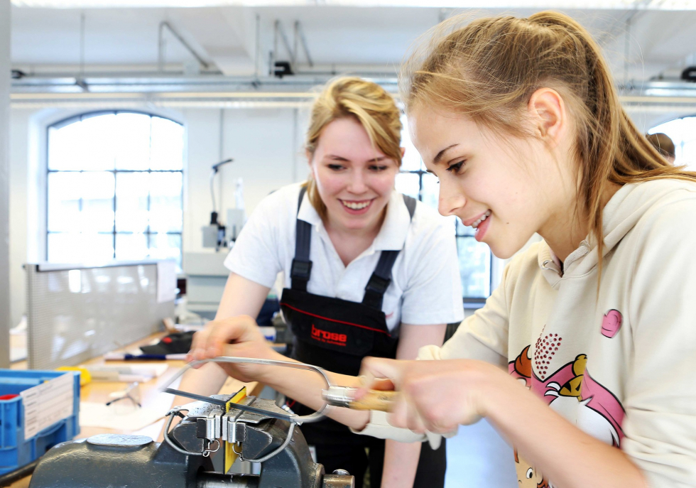 Beim Fertigen eines 'Mensch-ärgere-dich-nicht-Spiels' aus Plexiglas schlüpften die Mädchen in die Rolle der Werkzeugmechanikerin. "Das Beste war, dass ich selbst bohren und mein handwerkliches Geschick ausprobieren durfte und dass dabei sogar etwas herauskam." Damals haben ihr Azubis die ersten Handgriffe erklärt und gezeigt. Mittlerweile steht sie den Schülerinnen beim Aktionstag mit Rat und Tat zur Seite. Geduldig weist die angehende Werkzeugmechanikerin die Mädchen an den Maschinen ein und bringt ihnen den Umgang mit den Werkzeugen bei. "Man muss sehr genau arbeiten und ein wenig Geduld mitbringen", informiert die 19-Jährige. Ganz nebenbei beantwortet sie den interessierten Girls'Day-Teilnehmerinnen Fragen rund um die Ausbildung bei Brose.