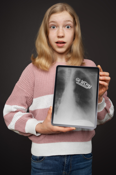 "Auf diesem Bild sieht man mich in der Rolle einer Wissenschaftlerin im Bereich "Medizintechnologie". Dieses Jahr hatte ich nämlich wieder das Glück, an einem Angebot vom Girls'Day 2022 teilnehmen zu können und einen Platz bei dem Online-Angebot des Fraunhofer-MEVIS-Institutes zu bekommen.
