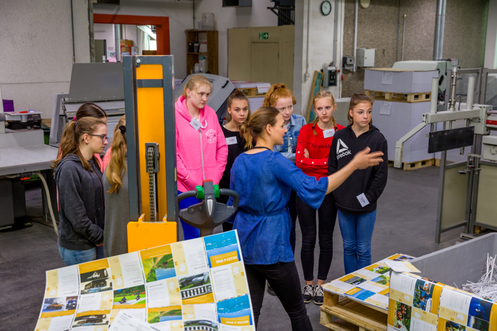 Nach Begrüßung und Vorstellung der Mädchen erhielten sie von Geschäfstführerin Pia Schmid einen Vortrag über die Branche, das Berufsfeld und den Arbeitsalltag in einer Industriebuchbinderei. Folgende Themen wurden behandelt: Was sind unsere Endprodukte? Wie ist die Wertschöpfungskette im Unternehmen? Wie sieht der Arbeitsalltag aus? Nach viel Theorie und einer Sicherheitseinweisung von Prokuristin Andrea Diegmann ging es dann endlich zur Betriebsführung. Die 3 Bereiche Büro, Lager und Produktion standen auf dem Programm.